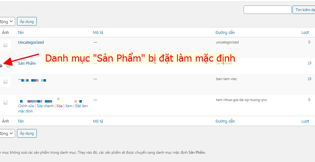 Danh mục “SẢN PHẨM” bị đặt làm mặc định.